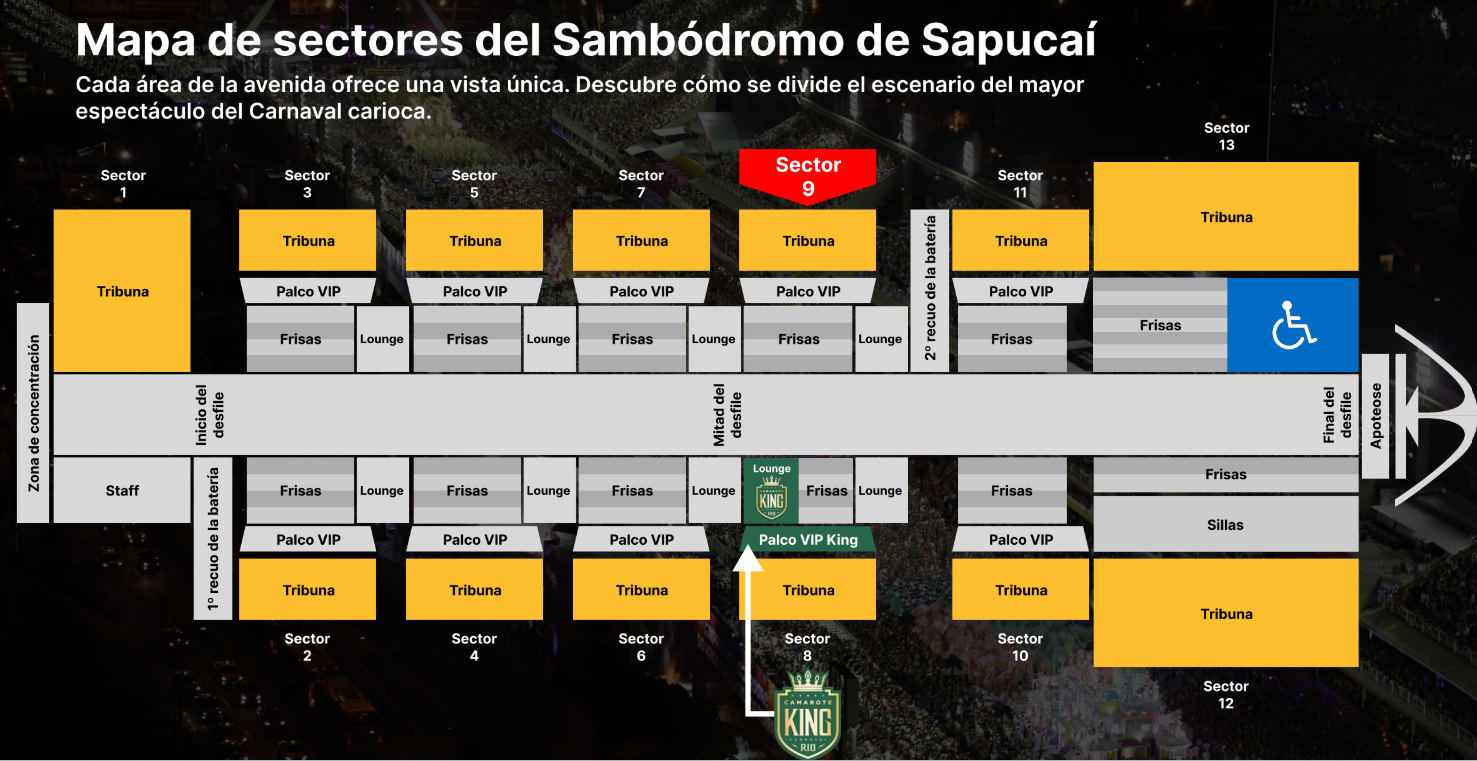Camarote o Palco KING: Es el espacio all inclusive más deseado del Sambódromo. Con ubicación privilegiada en el Sector 8, justo en el corazón de la avenida, ofrece una vista espectacular de los desfiles. Distribuido en dos niveles y con 2.300m², cuenta con un ambiente acogedor, buffet completo y barra libre con bebidas premium durante toda la noche.